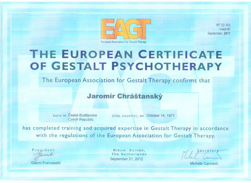 - Certifikát akreditovaného supervizora Evropské Asociace Gestalt Terapie (Certificate for an Accredited Supervisor EAGT)