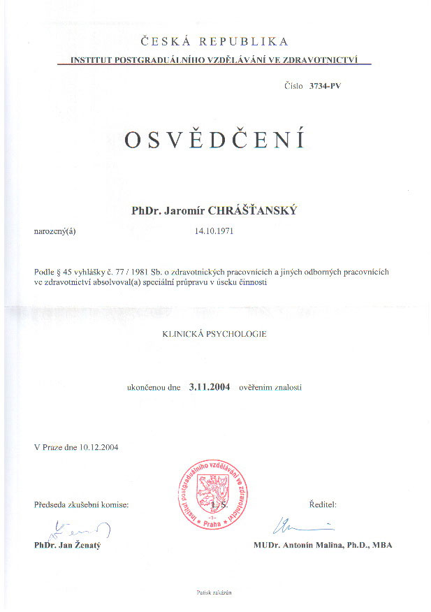 - Osvědčení o absolvování speciální průpravy v úseku činnosti Klinická psychologie ukončené ověřením znalostí (Atestace)